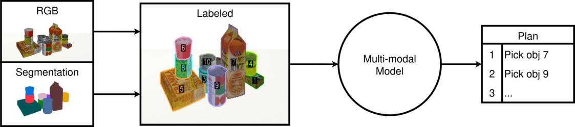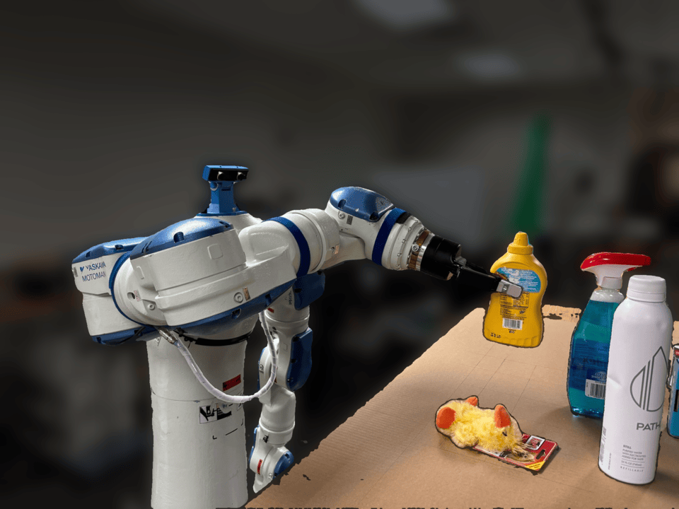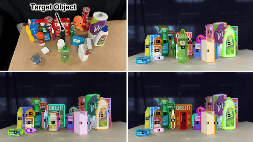 The real-world experiments were performed with a single arm of a Yaskawa Motoman SDA10F robot using a Robotiq 85 gripper and a Zed Mini camera. Grounding SAM 2 is used for object segmentation.