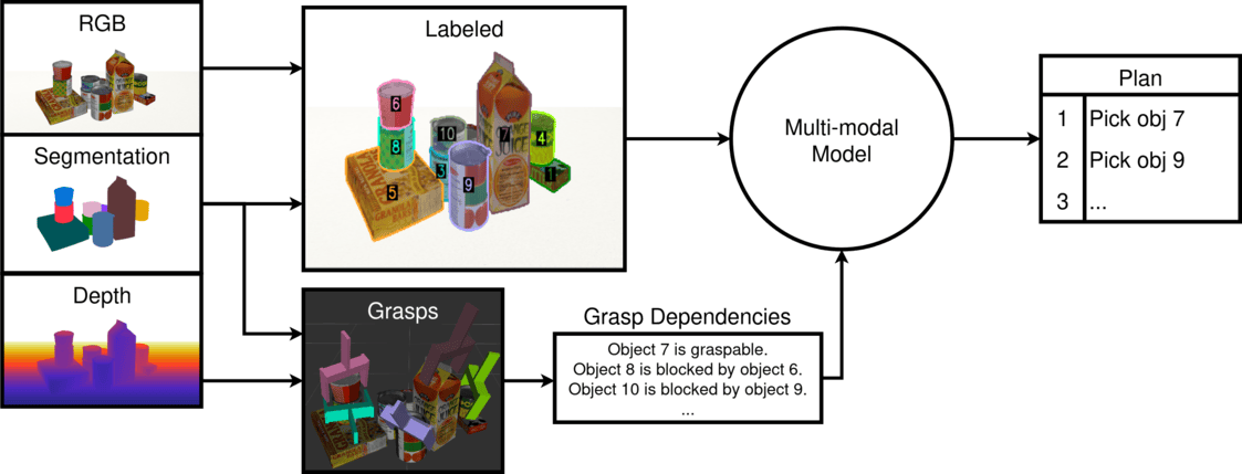 For the VLM-SELECT selection method, a VLM is prompted with a labeled image of the workspace and asked to come up with a sequence of actions to retrieve the target object. The VLM used in this work is Google Deepmind's Gemini Robotics-ER 1.5 since it is pretrained for robotics tasks and is available for public use. The result is parsed and the first object in the sequence is chosen. VLM-SELECT does not have knowledge of which objects have valid grasps. Due to the stochastic output of the VLM, it is called again if it fails to select a graspable object.