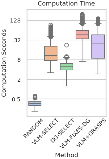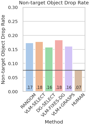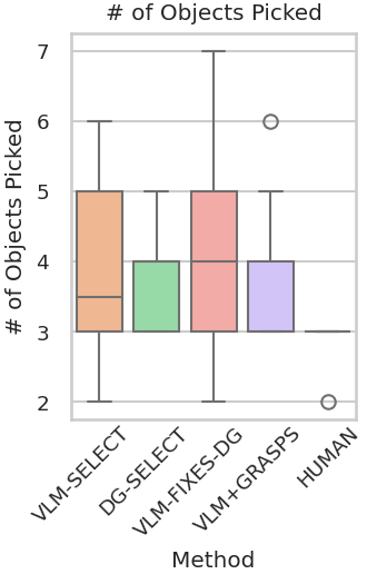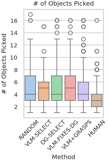 In addition to the four object selection methods, a random method was included as a baseline. Five different human experts were also asked to perform object selection on each of the 40 problems, for a total of 200 human trials. The corresponding approach is marked as HUMAN. Each selection strategy (RANDOM, VLM-SELECT, DG-SELECT, VLM+GRASPS, VLM-FIXES-DG) was evaluated 10 times on each problem for a total of 400 experiments per approach. In simulated experiments, ground-truth object instance segmentation from MuJoCo is used to isolate the evaluation of object sequencing.