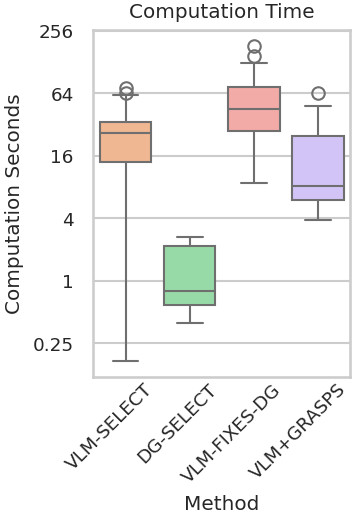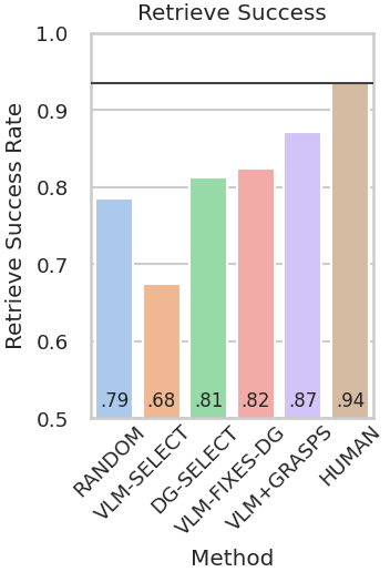The results show that using a VLM out of the box (despite being pretrained for robotics) is even under-performing making random selections among directly graspable objects. The dependency graph approach, DG-SELECT, is more successful than RANDOM and VLM-SELECT but critically depends on the parameters of the heuristics, which were tuned to optimize performance in these experiments. The VLM-FIXES-DG approach, which used the VLM to automatically define the dependency graph achieved similar success rate to DG-SELECTwith some increase in number of objects picked till success was achieved. Feeding the grasp information into the VLM and allowing the VLM to make the object selection as in the VLM+GRASPS approach achieves the highest success rate, while requiring a similar number of objects to be picked as in the DG-SELECT approach. The VLM-based solutions required increased computation time due to the call to the remote Gemini service. All the automated task planners exhibit similar rates of non-target objects rolling off the tabletop during the retrieval process, which in some cases arises due to simulation artifacts.