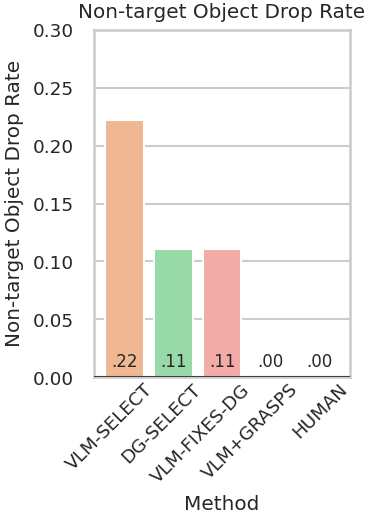 The real world experiments yield similar observations to the simulated experiments. While the real system consumes more noisy perception data, which can lead to incorrect target detection, success was quite high. A potential advantage of the VLM-based solutions is that they experience a smaller real-to-sim gap given real image input. Still, the VLM-SELECT approach underperforms the alternatives, as it has the lower success rate. The methods that make the final selection via a Dependency Graph, i.e., DG-SELECT and VLM-FIXES-DG, have high success rate but still occasionally dropped objects. The VLM+GRASPS hybrid solution was the best performing method, solving all real scenes without any object drops similar to the human experts.