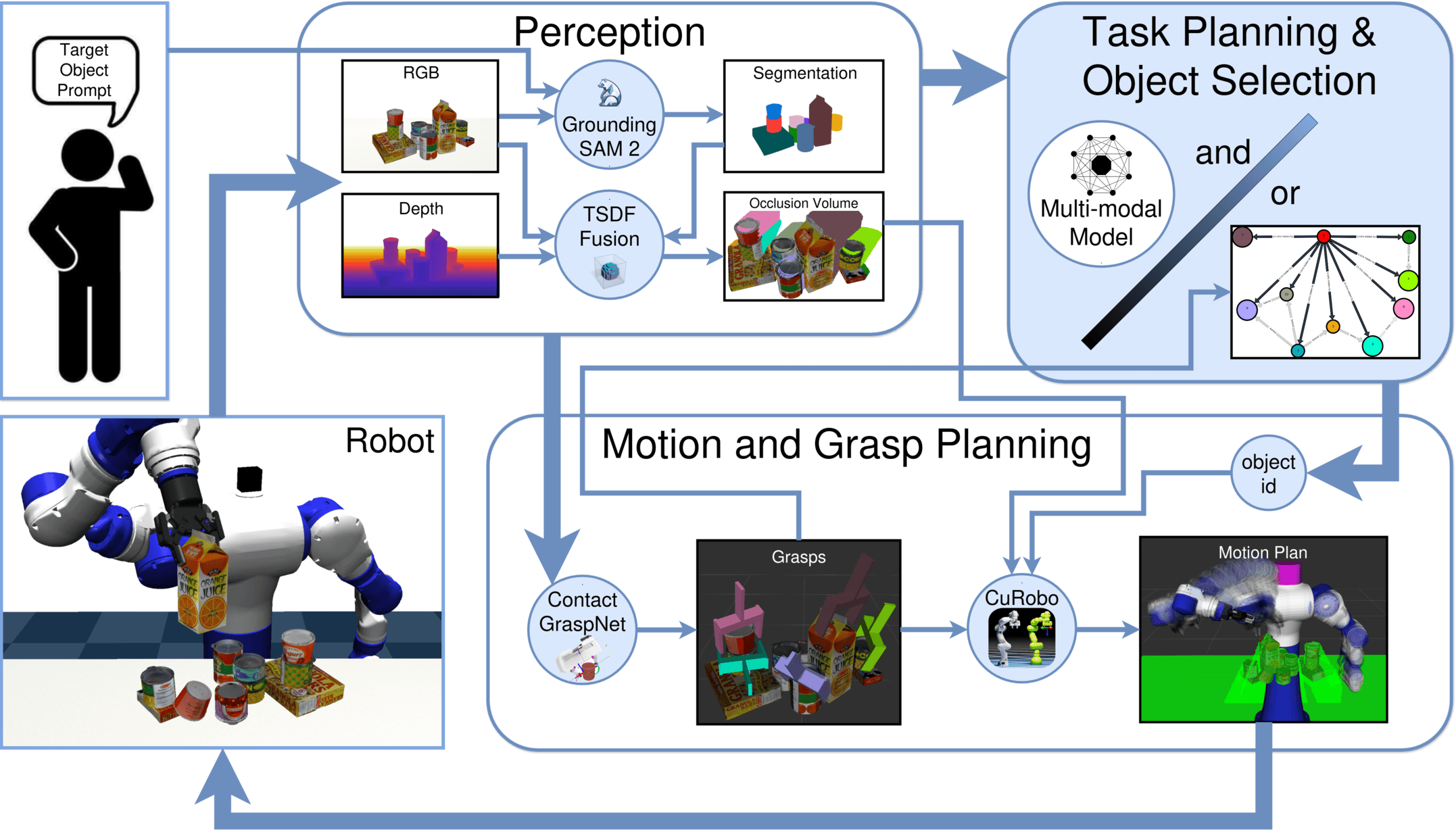 We set up the following open-loop pipline to address the TORC problem. First, camera RGB and depth images are fed into GSAM2 and TSDF fusion to generate a segmentation image and a 3D occlusion volume respectively. The camera point-cloud is used by Contact GraspNet to generate a grasps for the objects in the scene. Grasps in collision with other objects or have no collision-free IK solutions are filtered out. Then, a task-planning method makes a decision on what object to retrieve for this "pick." CuRobo then computes motions plan to retrieve the target object using its highest-scoring grasp. Finally, the motion plan is executed on the robot, and the robot moves onto the next pick. In each experiment robots are given at most 15 picks to retrieve the target object.