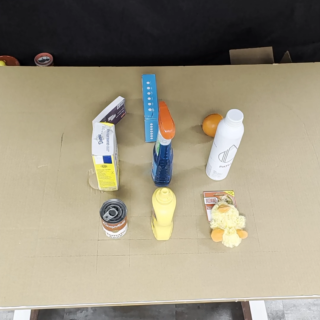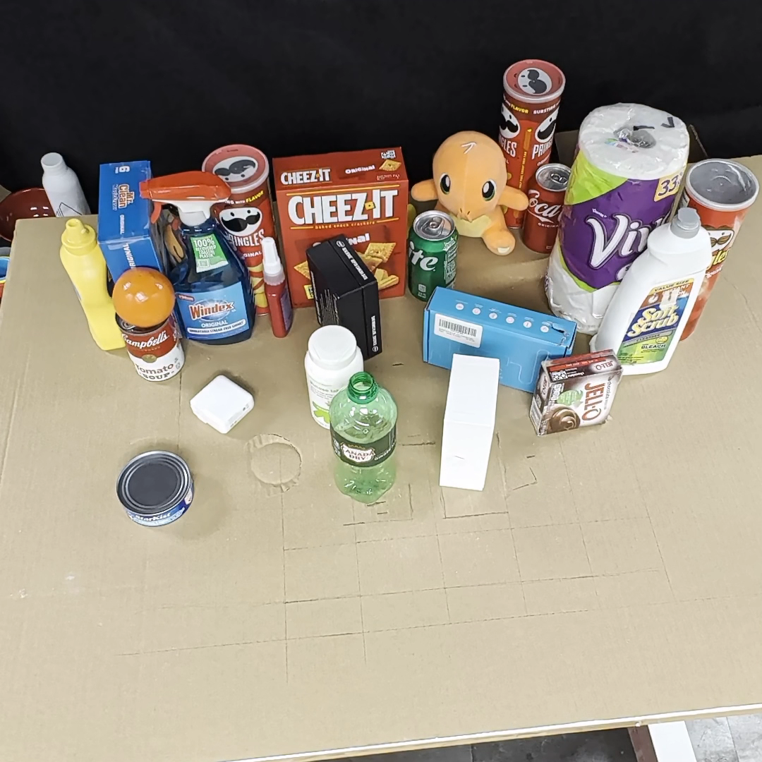 We created 40 unique experiments using 22 simulated scenes, with each scene containing a unique target object. Physics simulation and perception were performed using MuJoCo. These scenes were obtained by programmatically generating a large set of scenes that were then filtered down by scripts and human evaluation, as documented below. and multiple objects from each scene were used as target objects, leading to a total of. Therefore, the final set of scenes have non-conseuctive IDs. The following is an interactive visualization of our simulated scenes. The target object is marked by the "0" segmentation in red. You can use the slider below to scrub through the scenes.